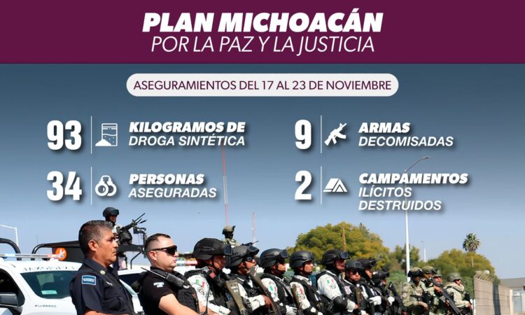 • También se aseguraron 9 armas de fuego y se destruyeron 2 campamentos ilícitos Morelia, Michoacán, 24 de noviembre de 2025.- Durante la última semana, elementos de la Secretaría de Seguridad Pública (SSP), en coordinación con autoridades federales, aseguraron más de 93 kilogramos de drogas sintéticas y detuvieron a 34...