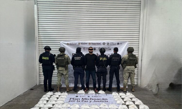 Morelia, Michoacán, 20 de noviembre de 2025.- Como resultado de las labores operativas y de inteligencia contempladas en el Plan Michoacán por la Paz y la Justicia, elementos de la Secretaría de Seguridad Pública (SSP), en coordinación con la Secretaría de la Defensa Nacional (Defensa) y Policía Morelia, aseguraron aproximadamente 50 kilogramos de sustancia granulosa con características propias de metanfetamina, además, se detuvo a un hombre relacionado con estos hechos.