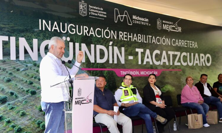 Tingüindín, Michoacán, 12 de diciembre de 2025.- El gobernador Alfredo Ramírez Bedolla inauguró la rehabilitación de la carretera Tingüindín–Tacátzcuaro, la cual comprende 5.8 kilómetros en beneficio de 10 mil 600 habitantes de la región.